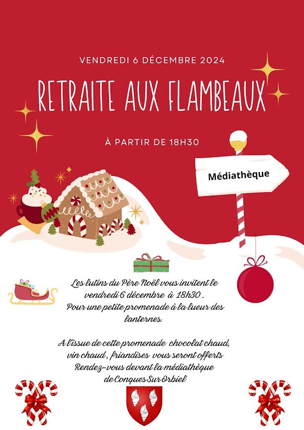 Rendez-vous est donné sur le parvis de la Médiathèque, dans le «jardin de Noël» proposé par les bénévoles, élus et habitants de Conques-sur-Orbiel. Des décors colorés qui font la joie des petits et des grands. La retraite aux flambeaux cheminera du jardin de Noël à l'espace détente du complexe Félix-Roquefort. Le père Noël, la mère Noël et les lutins ouvriront le cortège. Pour l'occasion, l'ancienne buvette de la piscine municipale est transformée en mini-guinguette avec une animation musicale pour accueillir les participants. Chocolat chaud, vin chaud, friandises, gourmandises et convivialité...